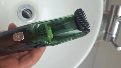 The built-in vacuum captures 95% of hair as you trim, sucking it directly into the chamber. No more wiping the sink, no more finding hairs hours later. Just trim, empty the chamber in 5 seconds, and you're done.