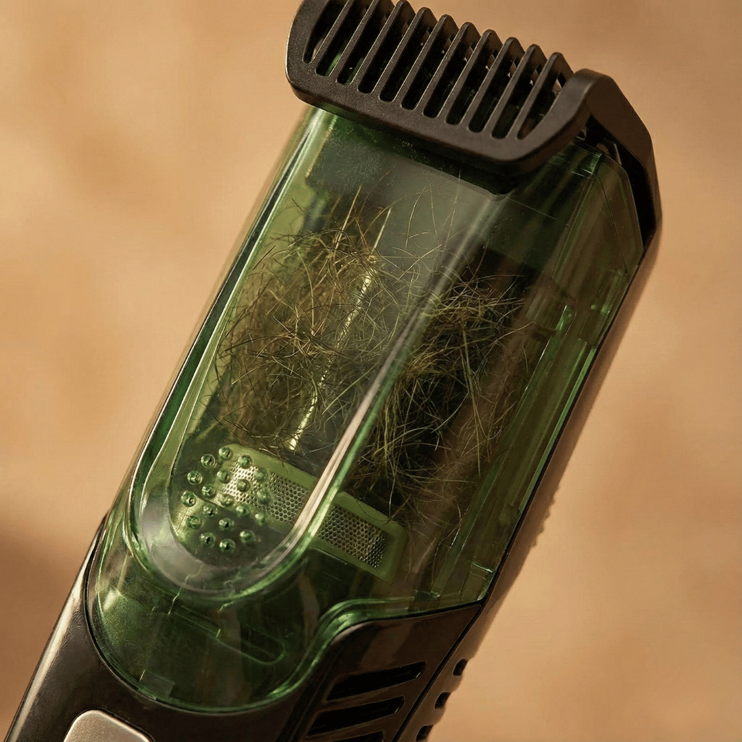 Yes. The built-in vacuum motor captures 95% of hair as you trim. You'll see it collect in the transparent chamber. No more hair in your sink, on your clothes, or scattered around the bathroom.